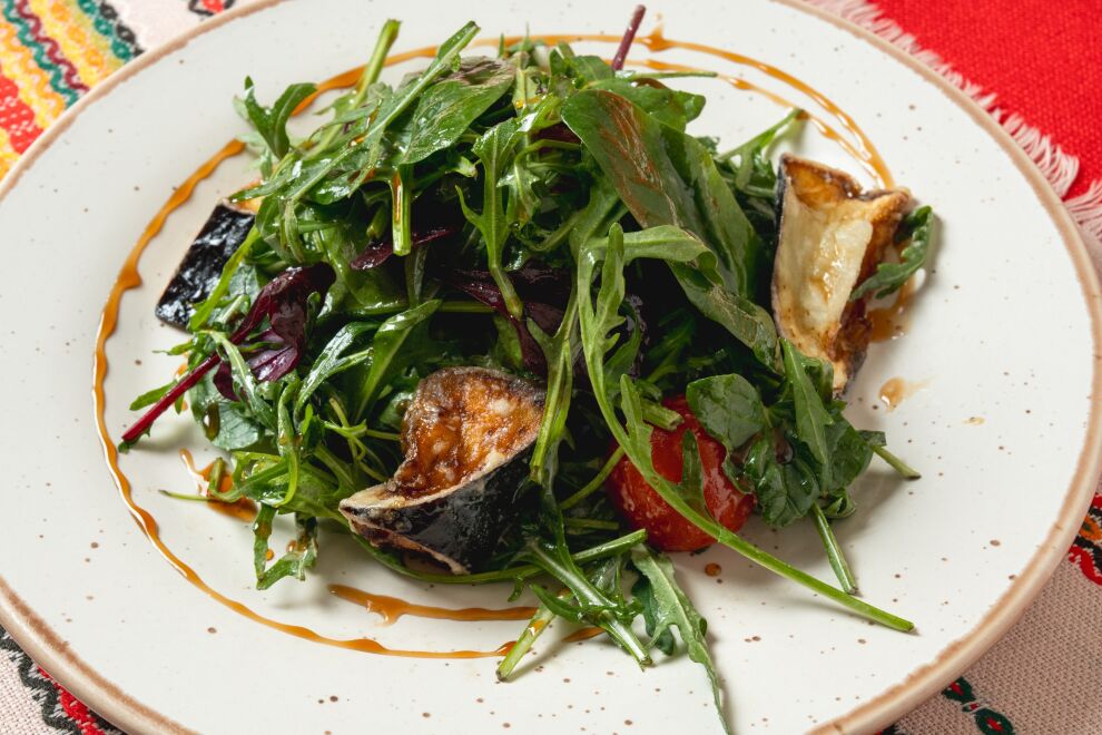 Микс салатов с хрустящими баклажанами, помидорами черри и киноа с заправкой тахини (кунжутная паста)