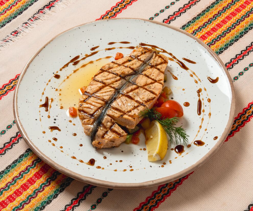 Стейк семги на гриле с соте из тушеных овощей и ореховым соусом