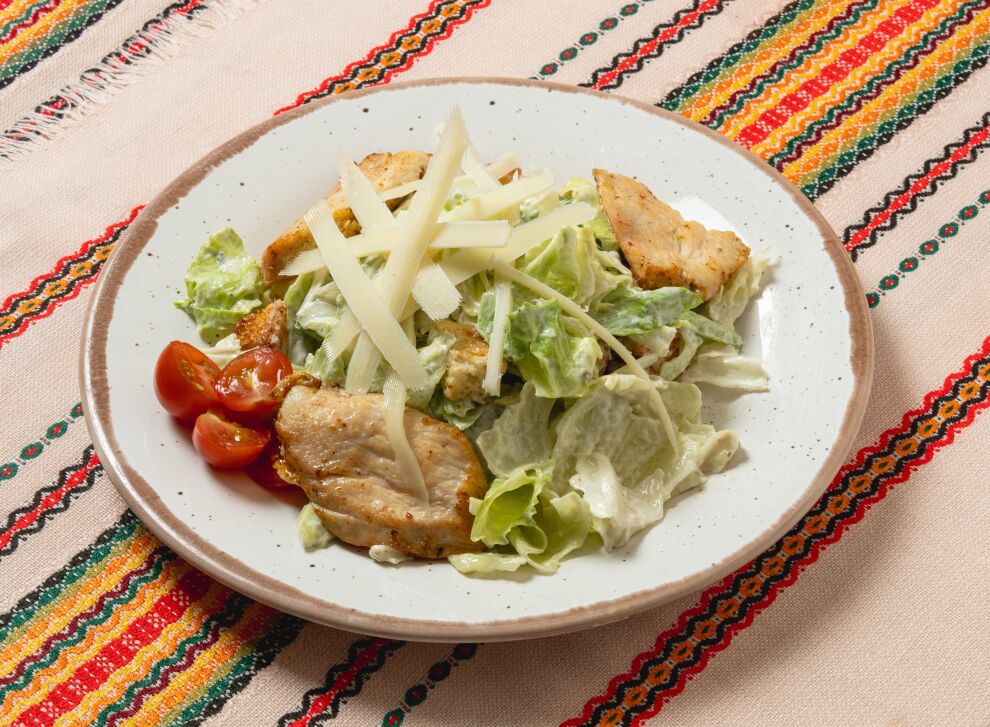 Листья салатов айсберг и романо, обжаренное куриное филе, помидоры черри, пармезан, гренки и соус цезарь ( анчоусы консервированные, каперсы, пармезан, яйцо, ворчестр, чеснок, оливковое масло и лимонный сок)
