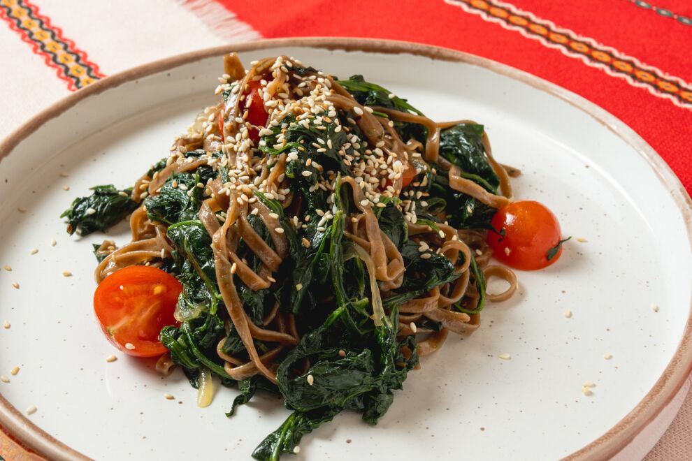 Лапша гречишная с помидорами, шпинатом и луком